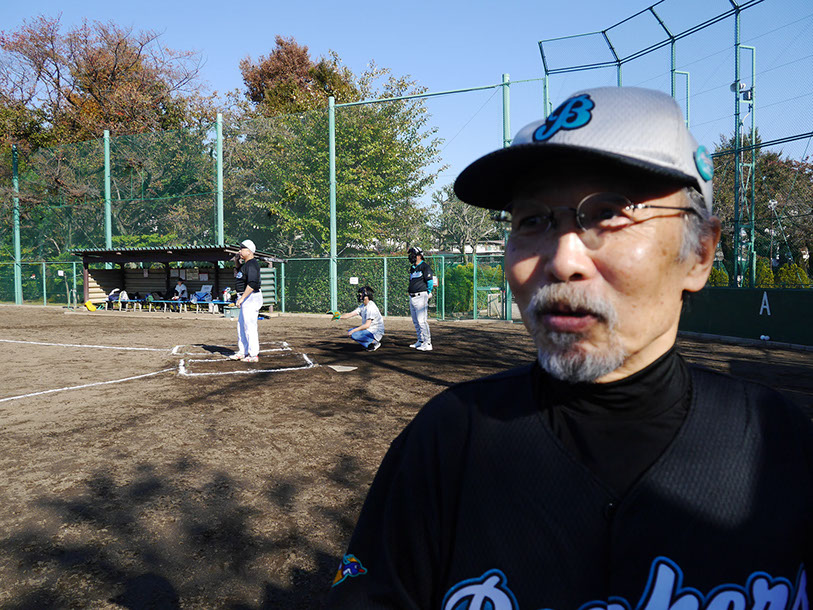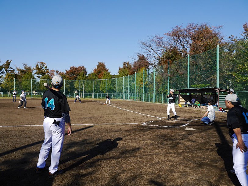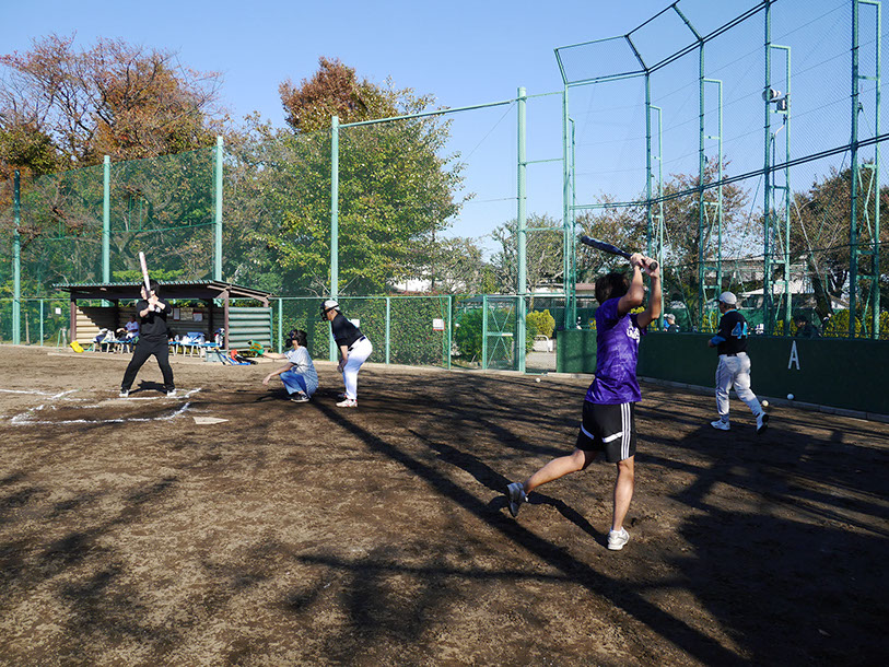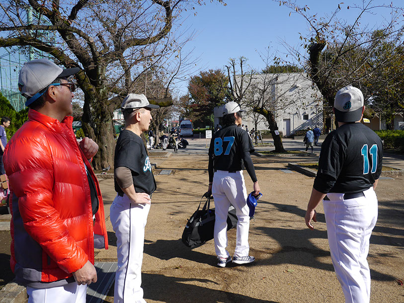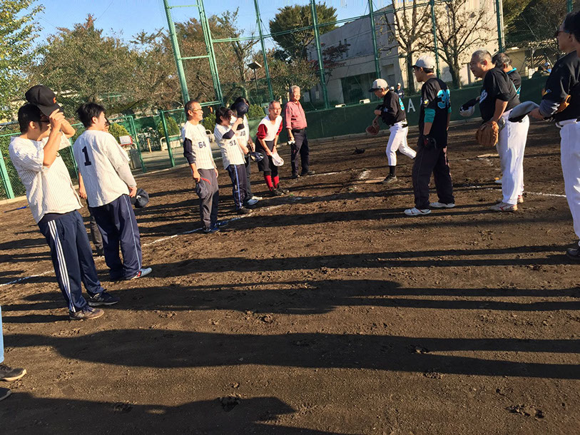 キャッチボールで遊んでいた若者3人に声かけると、快くいっしょに遊んでくれると。